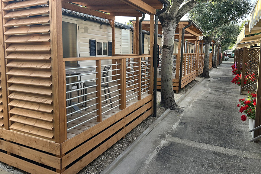 The mobile homes in Camping Liana are the perfect solution for those who are looking for a holiday in contact with the sea and the nature with all the comforts of a real home. Each of them has a wooden veranda, furnished with tables and chairs where to eat and enjoy the holiday.